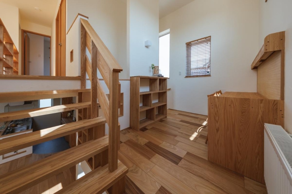 本棚や階段、手すりは全てレッドオークを使っています。設計を担当した白幡さんが自社の大工と相談しながら、階段や手すりは光が通るよう造作されていて、意匠と機能を両立させています。