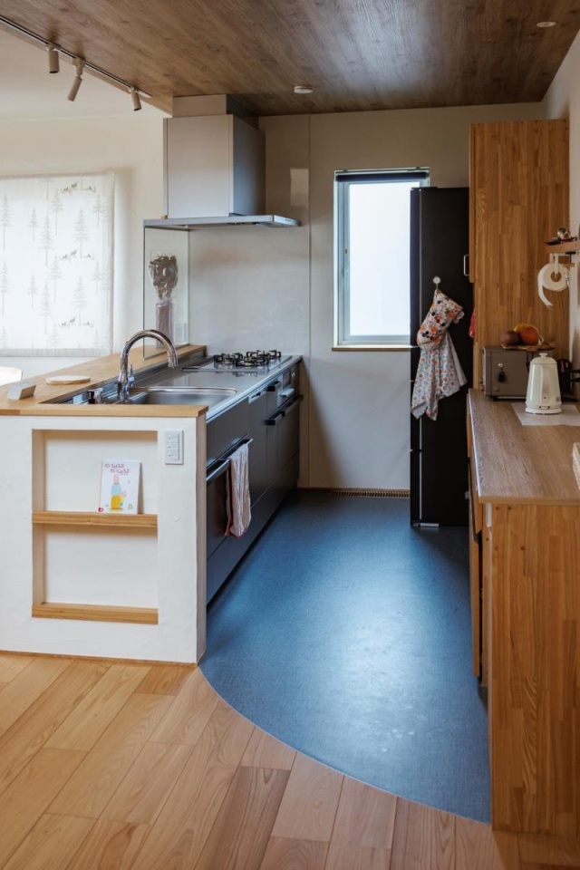 キッチンは、手入れがしやすいビニル床シートを採用。空間を緩やかに区切るアール型のデザインは、設計を担当した白幡結衣さんのアイデアです。