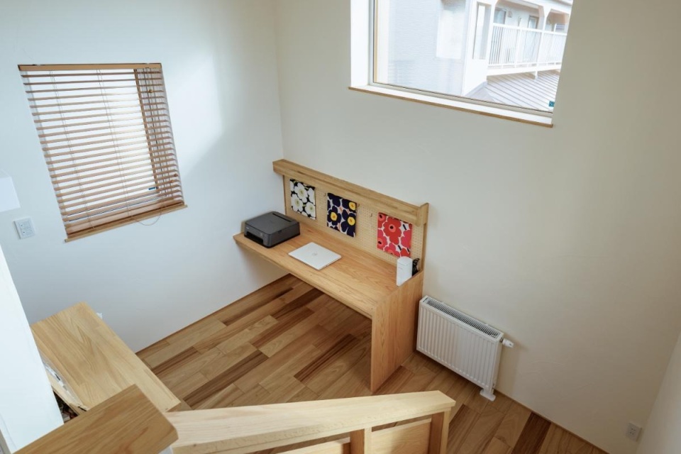 スキップフロアとなる中2階には、書斎や勉強スペースとして使える造作デスクを設けました。