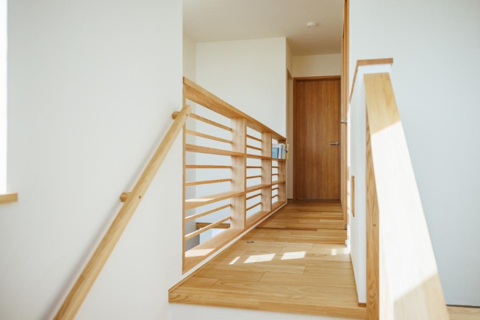 吹き抜けに面した2階の手すりは、本棚としても活用できるデザインにしました。