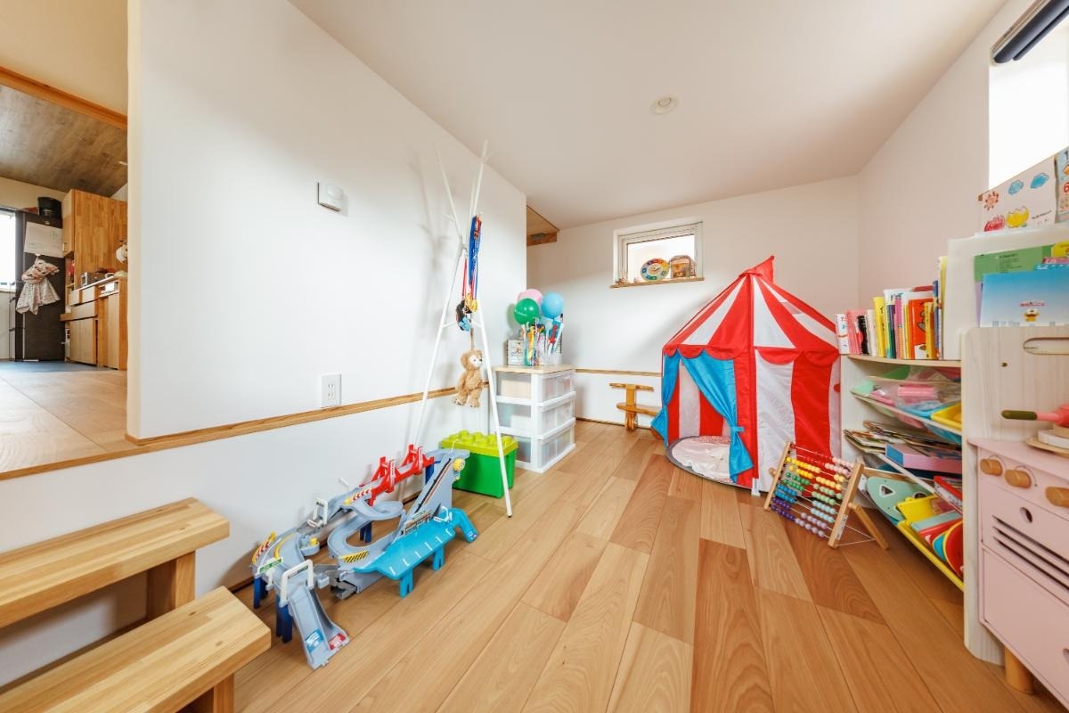 リビングからダウンフロアになったスペースは納戸で、2m弱と天井が低めになっており、子どものプレイスペースとして活用中です。
