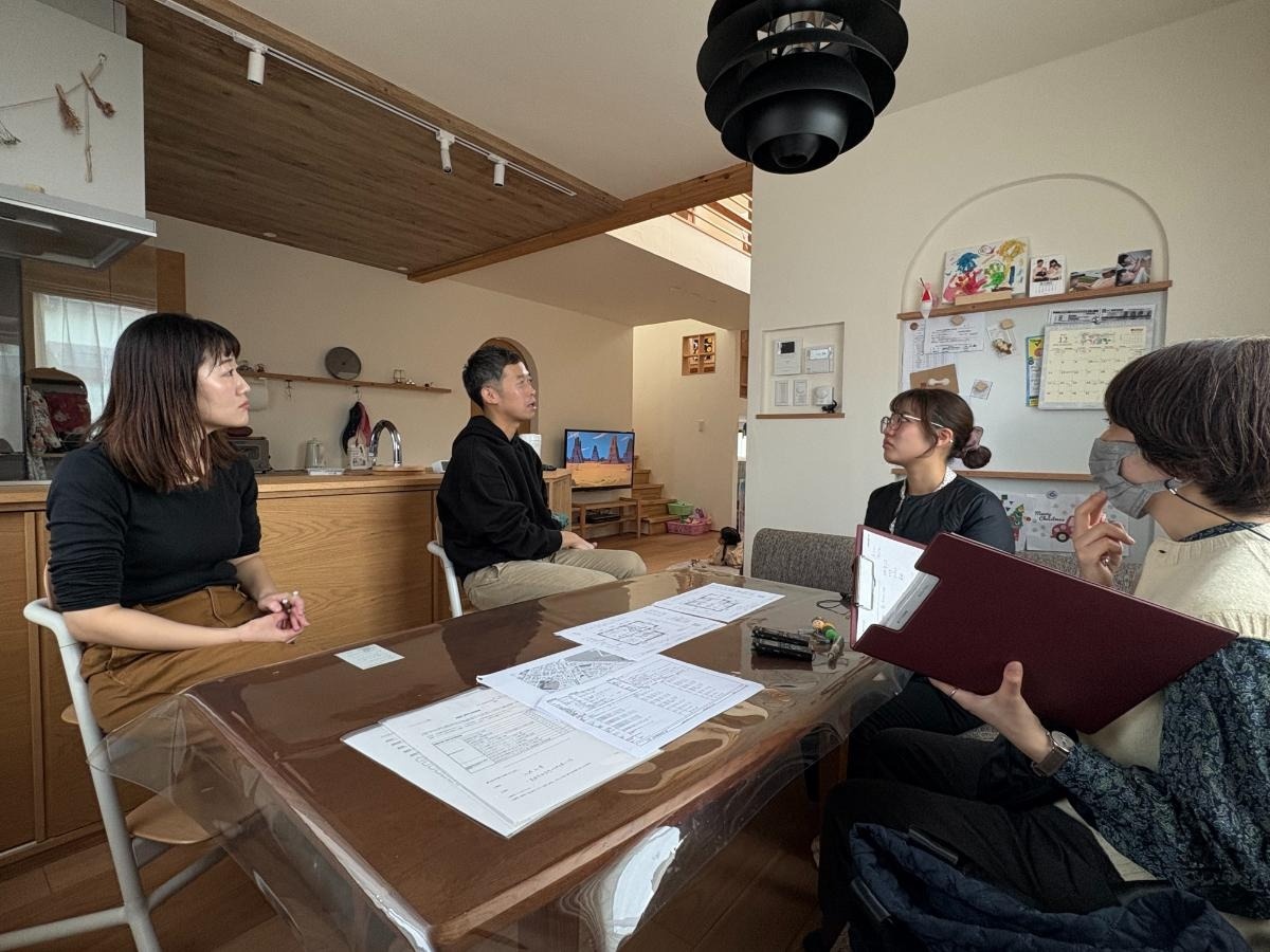 A 家づくりを始めた時は、苫小牧に住んでいました。社宅が手狭だったこともあり、打ち合わせは私たちが恵庭にあるキクザワさんの事務所に伺いました。子ども連れて行っても落ち着いて過ごせる居心地のよい事務所だったので、打ち合わせの時間は家づくりの話をしながらも、ホッとできるひとときでした。