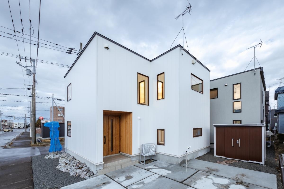 E邸は、恵庭市内の閑静な住宅地にあります。外壁はホワイトのガルバリウムサイディングを採用。玄関ポーチには道南杉が使われています。外構もキクザワにお願いしました。