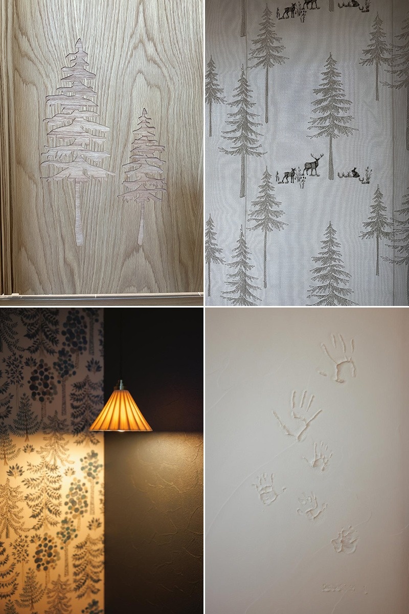 水回りへと続く扉に、レーザーで彫られていたのは木のシルエット。ダイニングのロールスクリーンや、トイレの壁紙にあしらわれた木のモチーフとリンクしたさりげないワンポイントが素敵です。