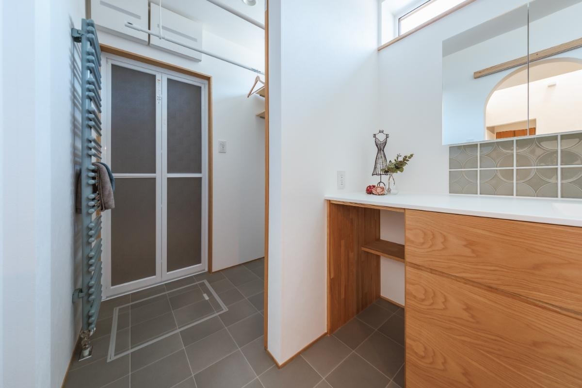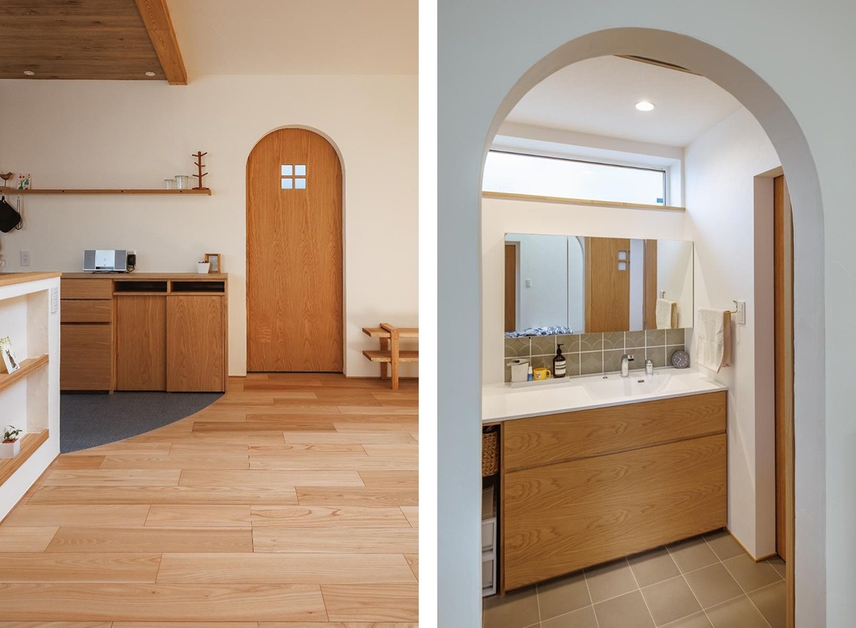 キッチンの右手にあるアール型の引き戸の奥にまとめた水回りも、木の質感にあふれる空間です。洗面室・ユーティリティー・バスルーム・トイレと水回りスペースが直線配置されています。