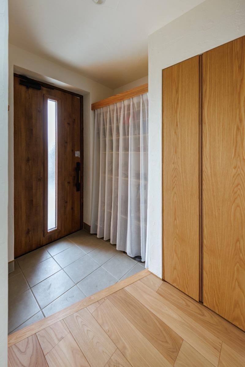 壁は全て漆喰です。カーテンの向こうには造作のシューズボックスが。ホールには物入れを設けました。