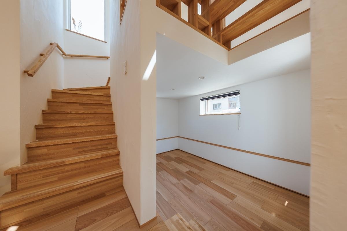 1階には、LDKと洗面室・バスルーム、個室としても使える納戸があります。LDKを中心に、各部屋が緩やかにつながる間取りです。床は天然木の風合いと、耐久性を両立したNODAのラスティックフロアを採用しました。