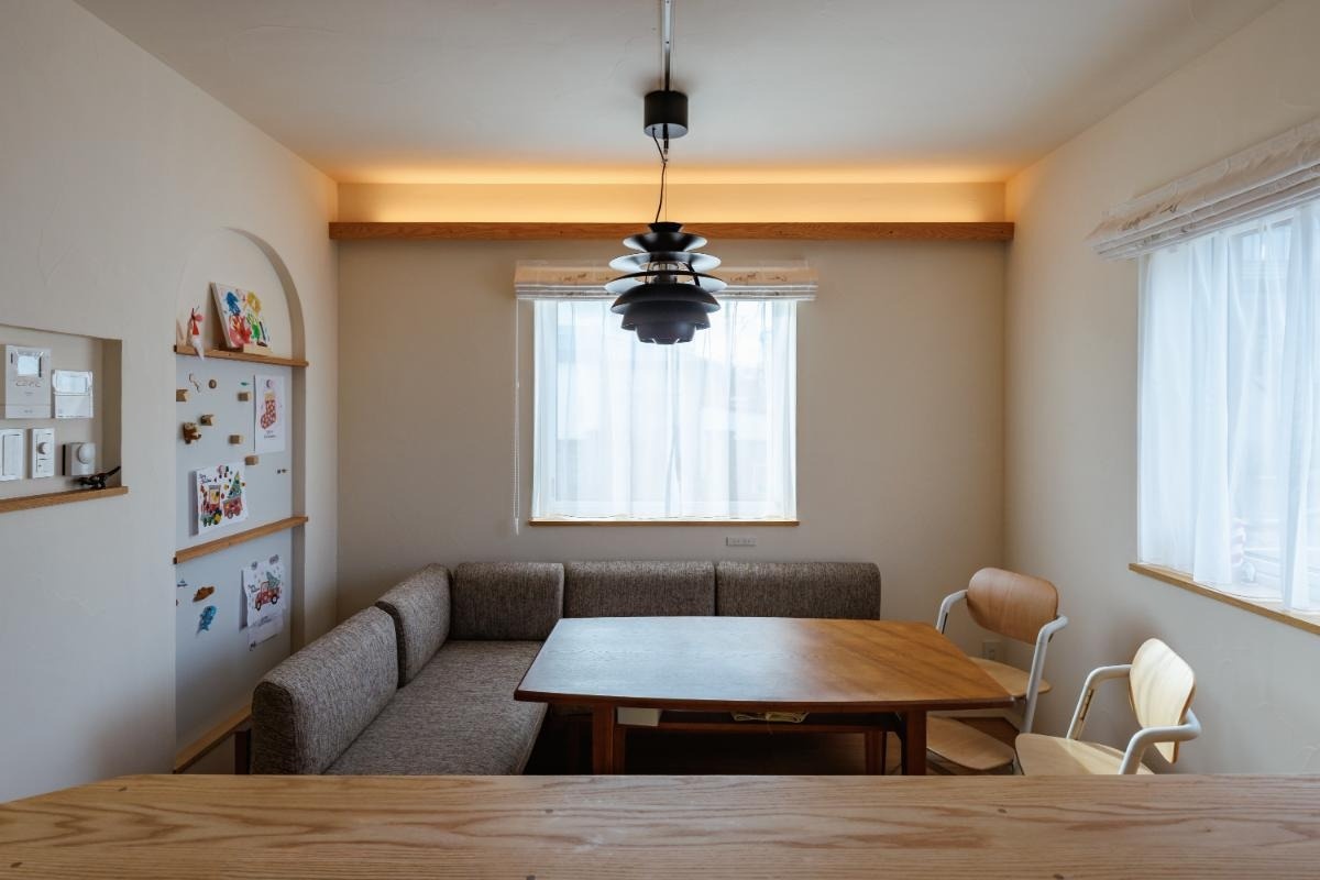 飾り梁を渡し間接照明を施した、居心地のよいダイニング。写真左のニッチ壁には鉄板が入っており、マグネットが付けられます。