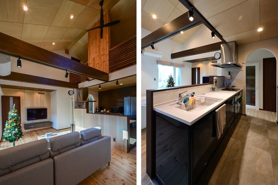 家を建てるにあたってHさんご夫妻が希望していたのは、性能面では光輝建設の強みである“4倍断熱”を採用し、デザイン面では木の素材感を生かした内装仕上げや切妻屋根、プラン面では行き止まりにならず、どの部屋にも行ける回遊動線などをカタチにした住まい。