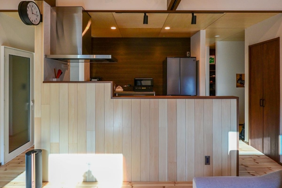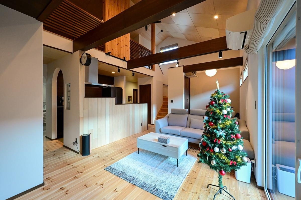 寒さをガマンし続けていた市営住宅から、玄関に入った瞬間に“暖かい”と感じるマイホームへ―。光輝建設の大工・棟梁でもあるHさんが奥さまと二人三脚で建てた住まいは、体感で暖かいのはもちろん、室内は木の意匠・質感を生かしたインテリアコーディネートによって、目に映る暖かさにもこだわっているのが大きな特徴です。