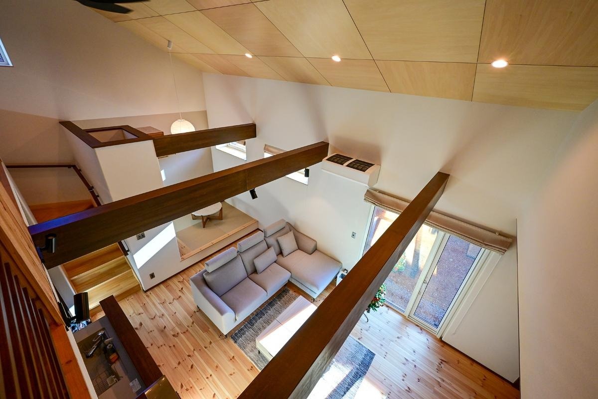 体感的に暖かいだけでなく、見た目にも暖かさを感じるのが、Hさんの住まいの特徴のひとつで、室内は床にパインの無垢材、壁・天井にシナベニヤや杉を使うなど、木の温もりを生かした仕上げが印象的。