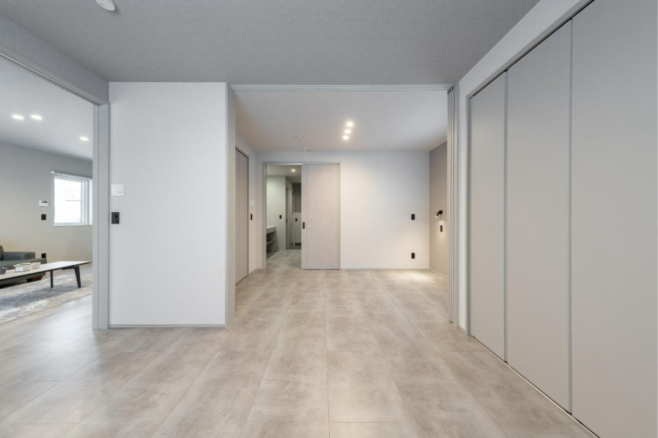 主寝室は広さが6帖とは思えないほどの開放感。全開にした引き戸の向こうにはさらに5.2帖の洋室が続いており、その先は洗面室やユーティリティーにつながる廊下が見えます。