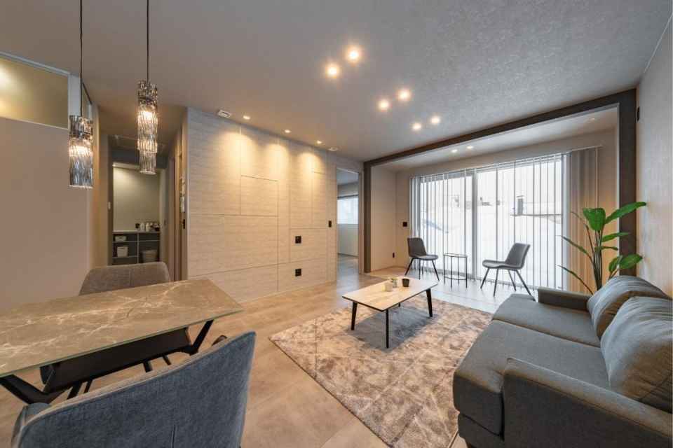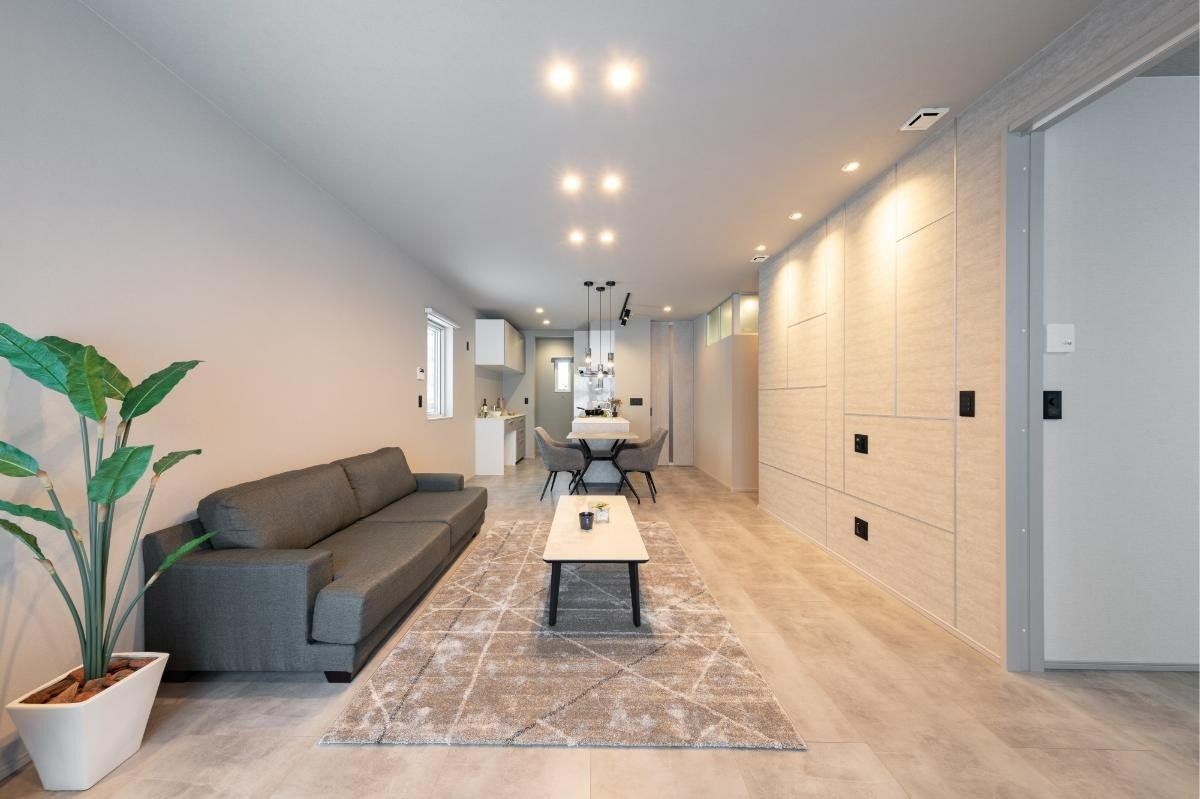 テラス窓の方向から見たLDK。ダウンライトで照らされた石目調のアクセント壁(右)は、アルミ素地の見切り材を使って四角い模様がデザインされていて、クリエイティブな演出が光ります。