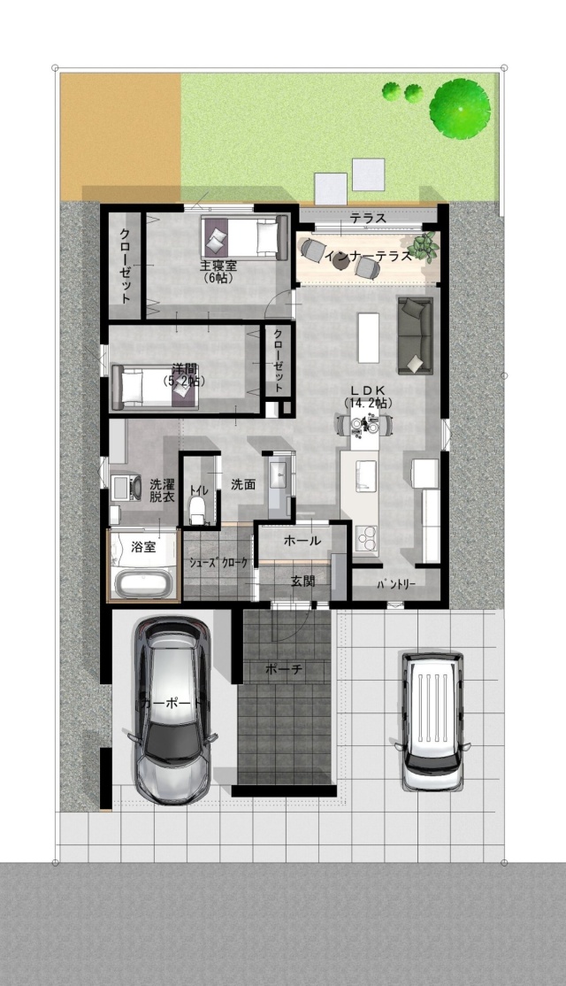 使いやすい動線で、コンパクトだけど広く見せる工夫や、インナーテラスのような+αの空間提案など、参考にしていただきたいポイントが満載です。