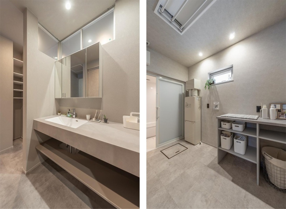 左/洗面室に進むと、ニュアンスカラーがオシャレな幅広の洗面化粧台がありました。人気のカウンタータイプの洗面化粧台。天井近くには採光窓も付いています。洗面室を出ると左手にユーティリティー、正面に洋室、右手にダイニング・キッチンが続きます。