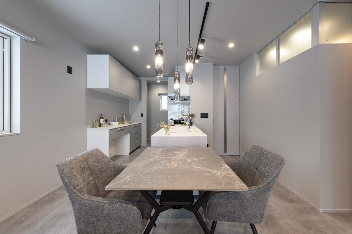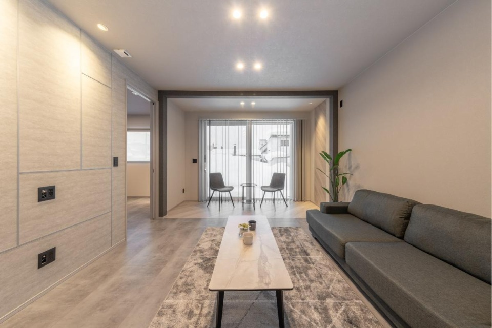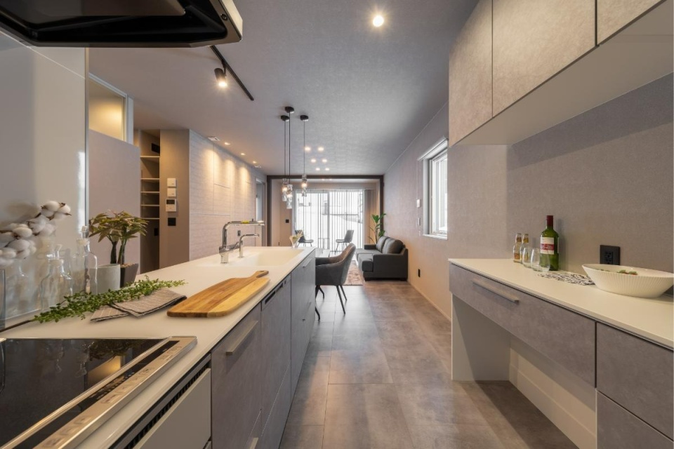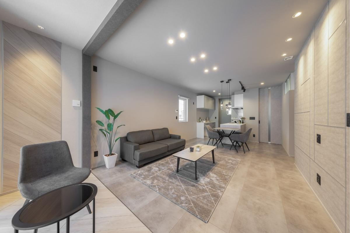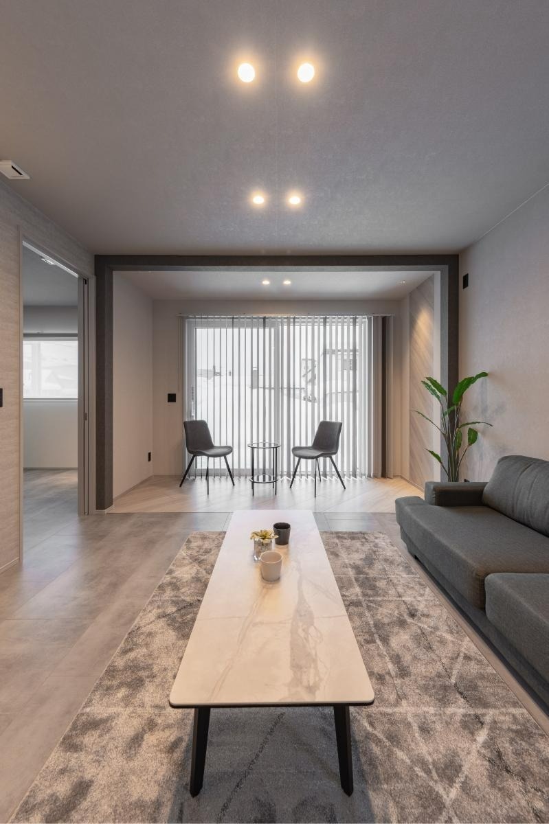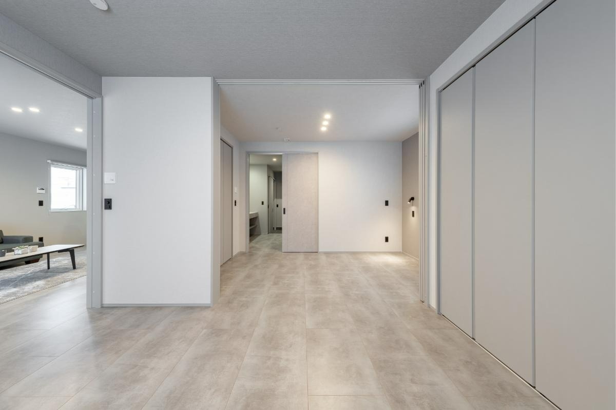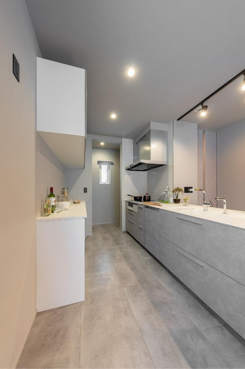 水回りの方向から眺めたLDK。モルタル柄の床材が創り出すグレイッシュな空間は、都会的で洗練された印象です。