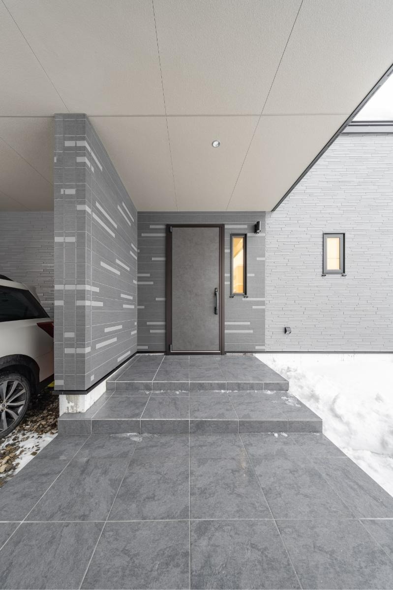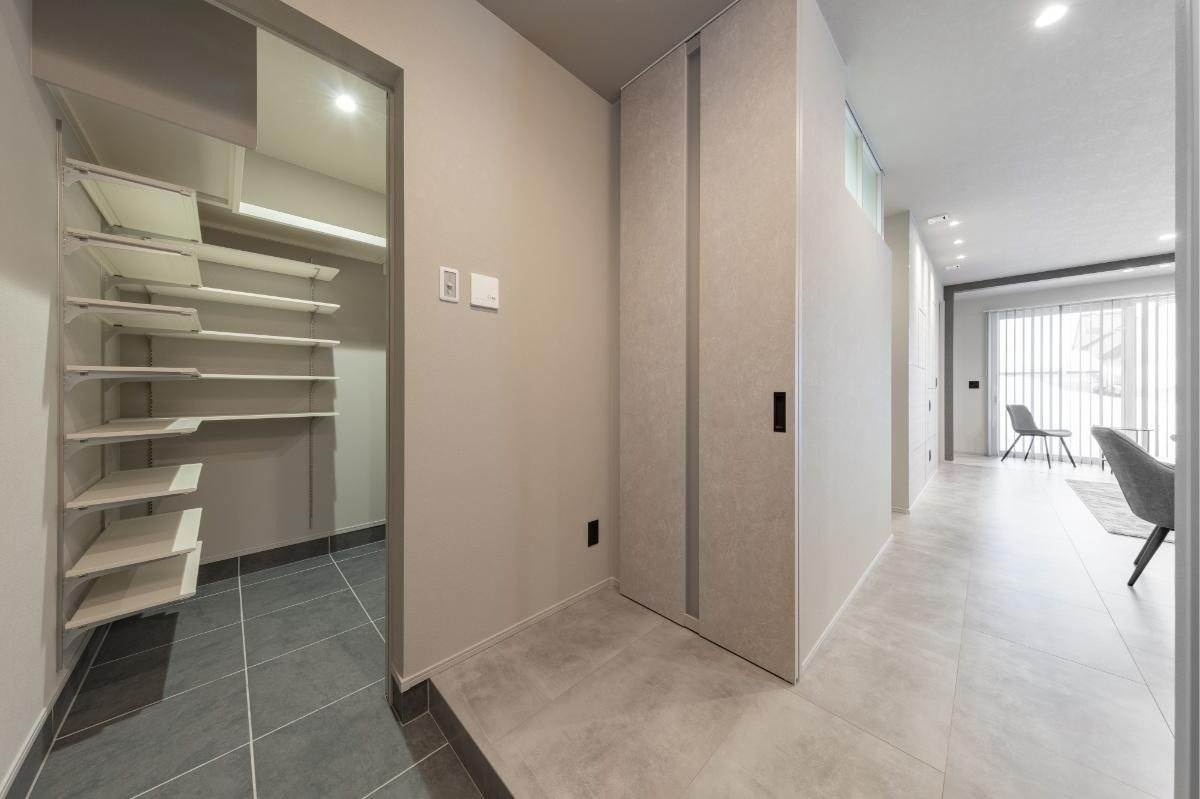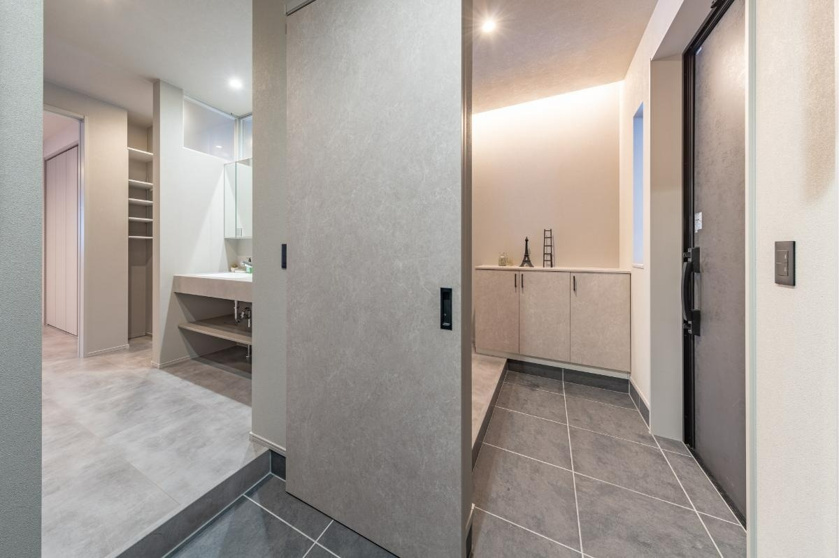 玄関もポーチと同じグレーの大判タイル敷きです。室内は高級感のあるグレイッシュカラーで統一されています。シューズクロークは洗面室に続いており、玄関はリビングと洗面室の2方向に分かれています。