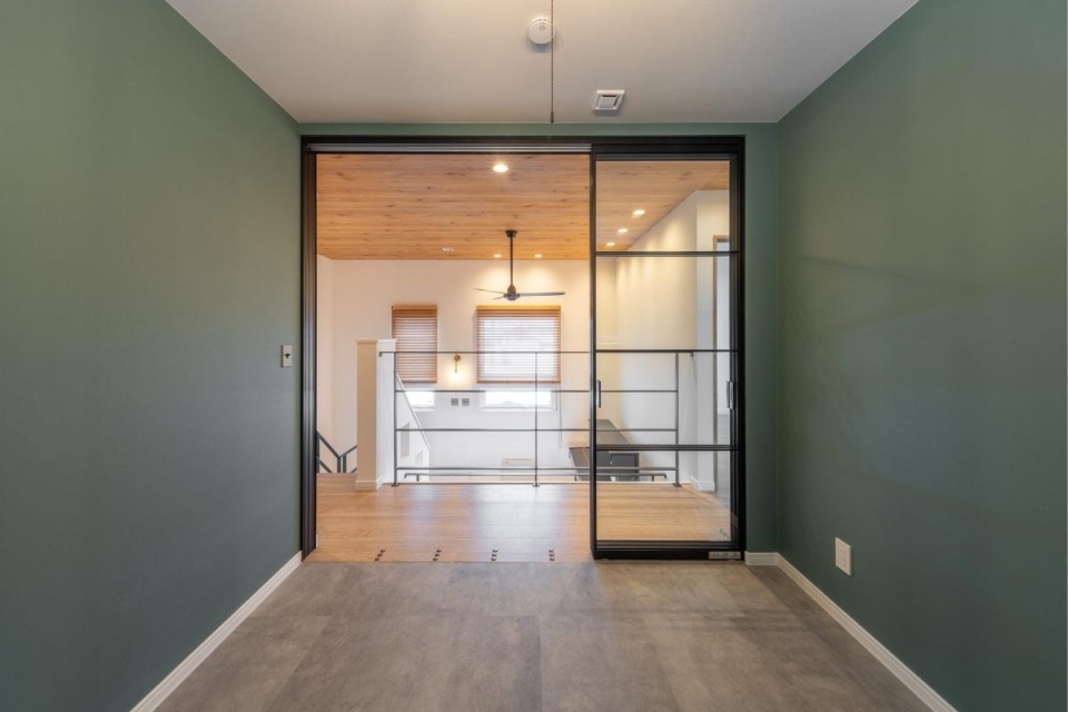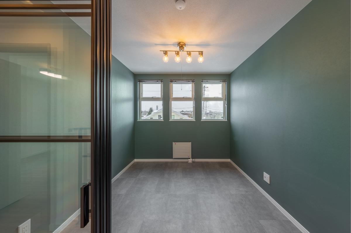 2階フリールームには深いグリーンをセレクト。ファサードで印象的な3連窓のある部屋で、どこかクラシカルな趣きです。