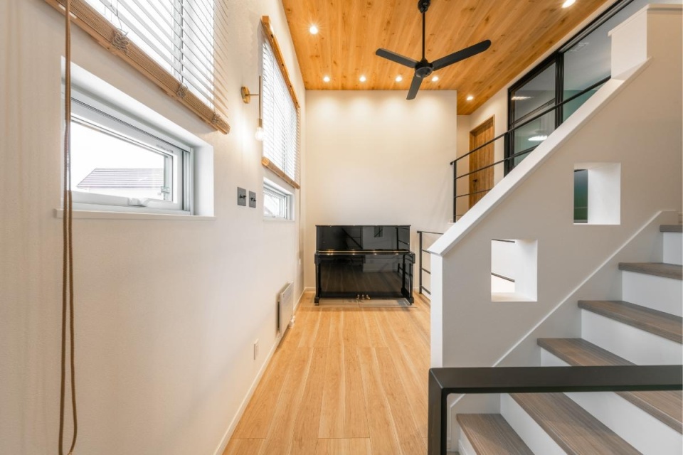 その上のスキップフロアには奥さまのピアノが置かれています。木目調の高天井にシーリングファンが回り、サーファーズテイストを感じる爽やかな空間です。