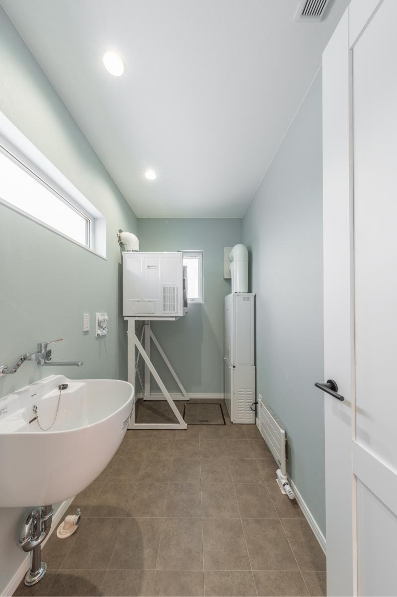 キッチンから行き来できる洗濯乾燥室には、西海岸テイストを思わせるミントグリーンの壁紙を選んでいます。スロップシンクやガス衣類乾燥機を備え、機能性もばっちりです。
