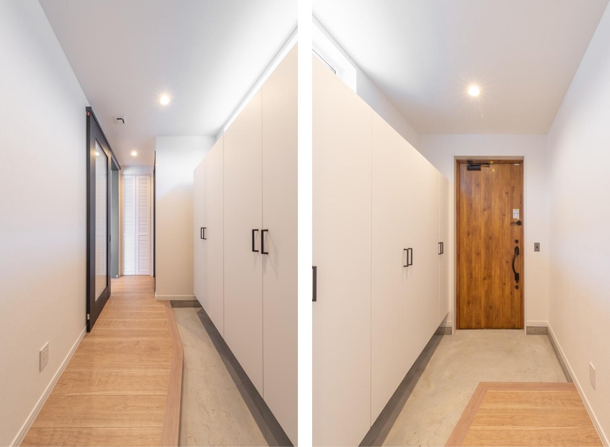 玄関は縦長の形状で、壁一面が扉付きの収納になっています。L字型の土間に、斜めにカットした縦長の上がり框が続きます。玄関土間は必要最低限の広さにとどめ、その分を居住スペースに充てたそう。