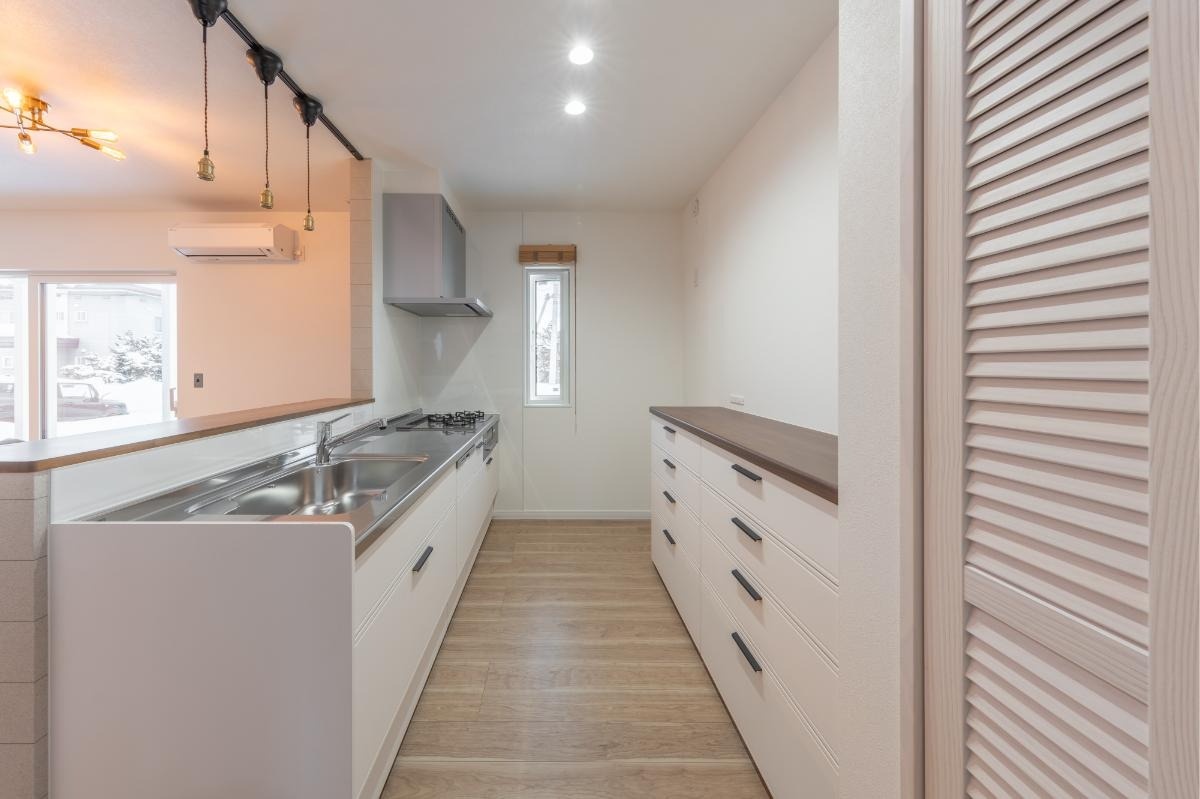 ホワイトで統一されたキッチン。収納のルーバー扉はサーファーズテイストの要になっていて、「絶対に譲れないポイント」だったと奥さま。