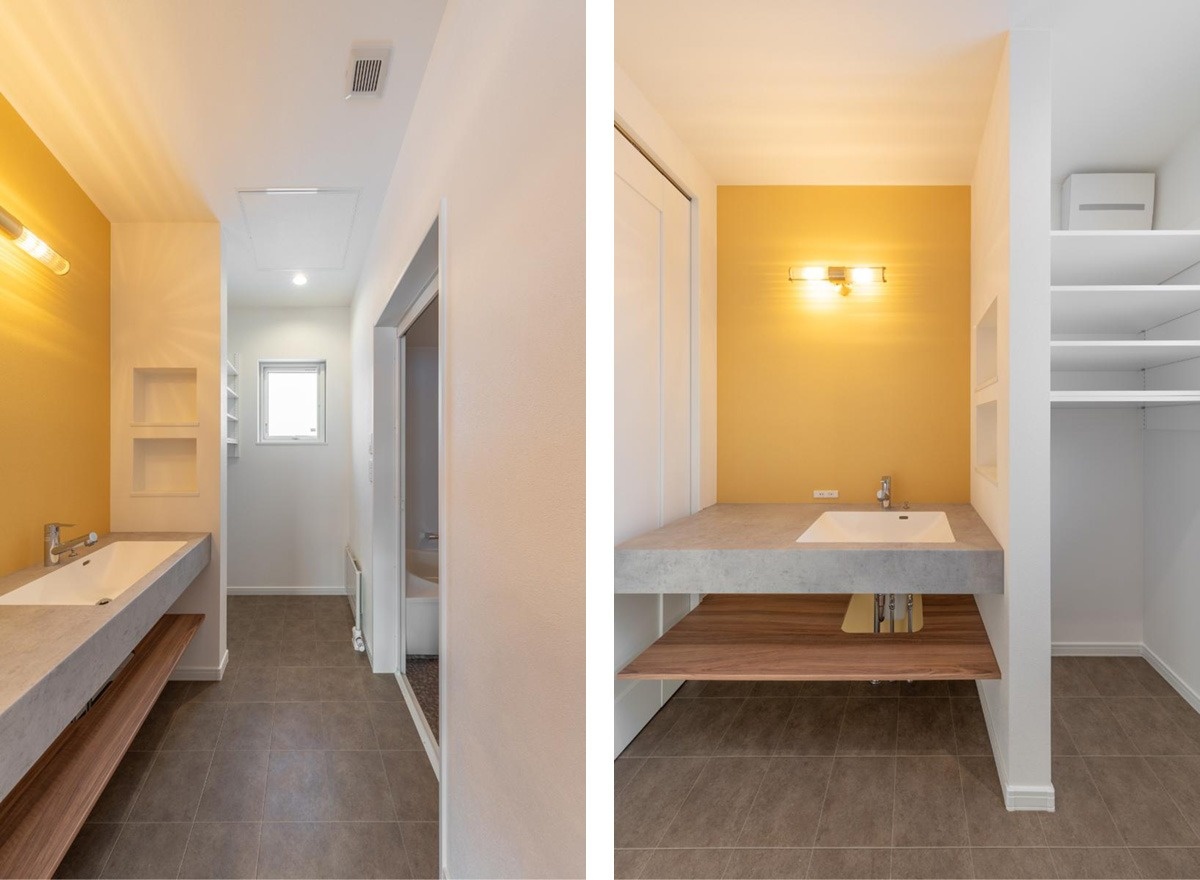 こちらはリビングから出入りできる洗面脱衣室。イエローの壁紙に、シックなモルタル調の洗面化粧台がマッチしています。朝の身支度も気分が上がる空間です。