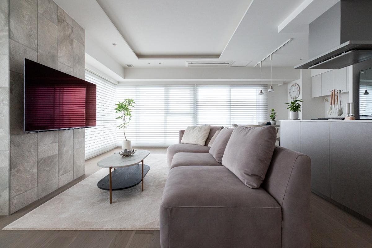 クロスは全室、シンプルにホワイトで統一し、デザイン性の高いタイルや家具が際立つインテリアプランになっています。TVの背面壁は、ご主人の希望でエコカラットを採用。ラグジュアリーで天井を高く見せる効果もあります。