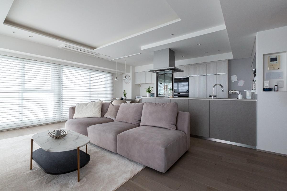 大きな窓が連続した明るいLDK。折り上げ天井で開放感が増しています。折り上げ天井を極力広げるために、既存のダウンライトだけでなく、難しいスプリンクラーの移設も実施。天井埋込型エアコンを交換し、空調設備も新しくなりました。