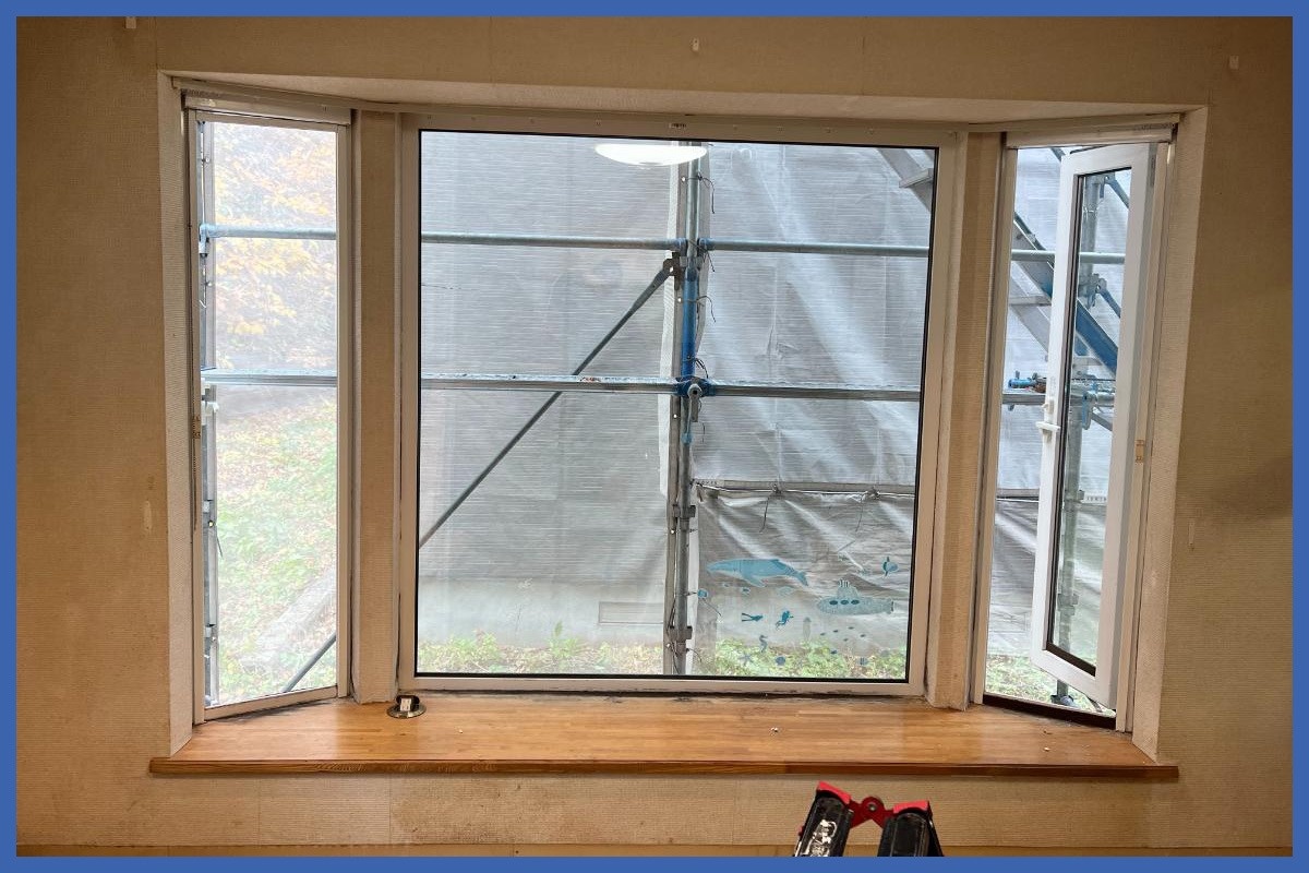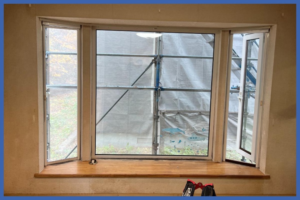ソファ正面の窓は、出窓から肘掛け窓に変更しました。窓際のラックは造作です。