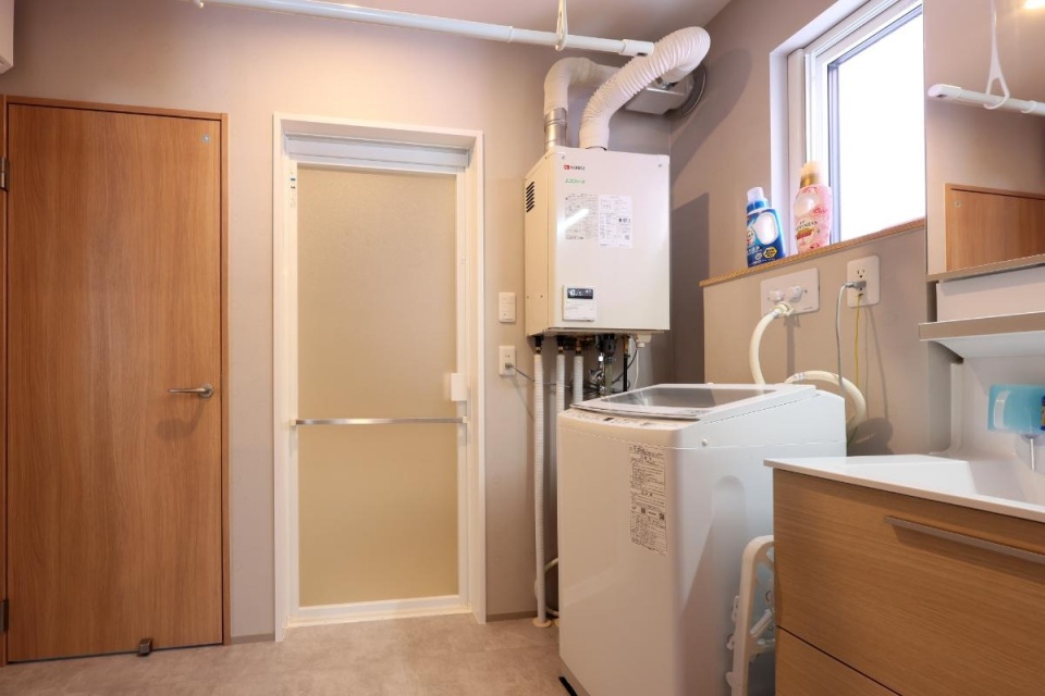 洗面脱衣室とバスルーム、トイレは、玄関とキッチンから行き来できます。