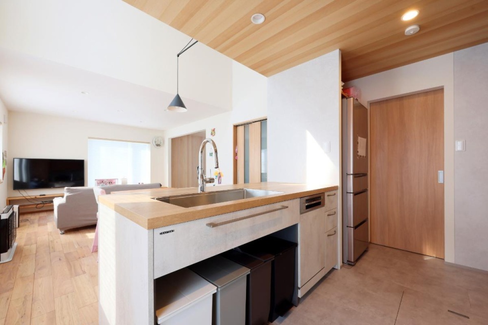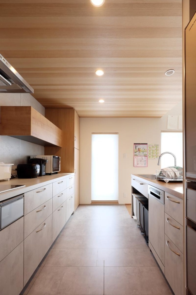 家族がコミュニケーションを取りやすいオープンな2列型キッチン