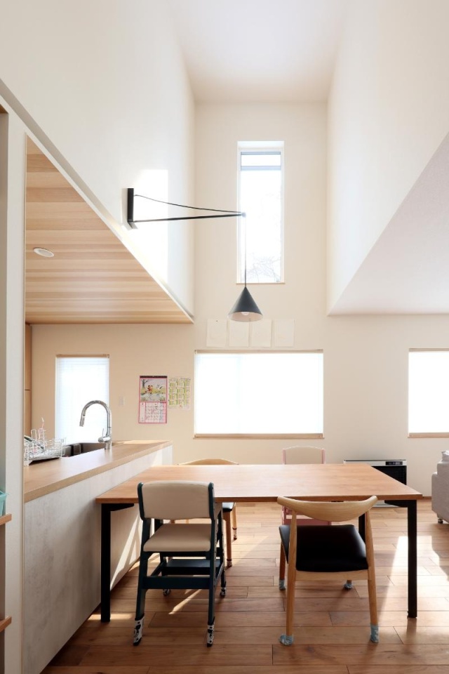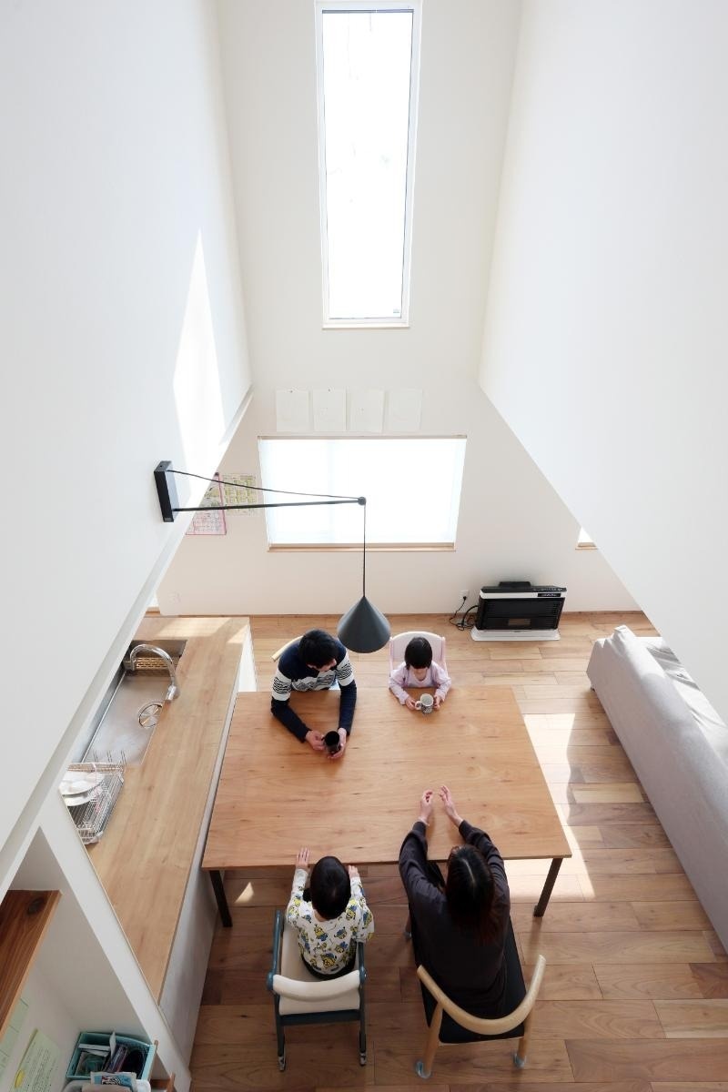 引き戸の先に広がるLDKの吹き抜けは、伸びやかで明るい空間です。南面の全ての窓に、太陽の熱を取り込む日射取得型の窓ガラスを採用しています。