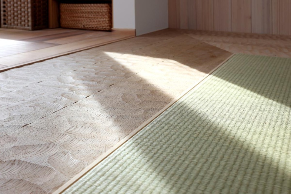 畳コーナーの全周に施したなぐり床は、足触りのよさと、光によって変わるニュアンスの美しさが魅力です。