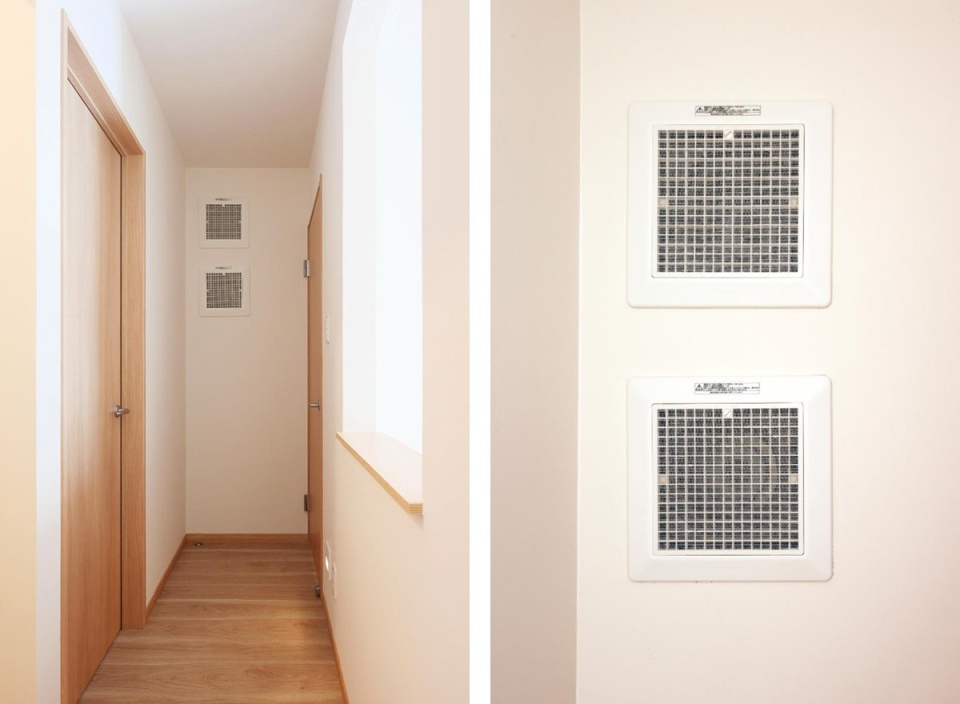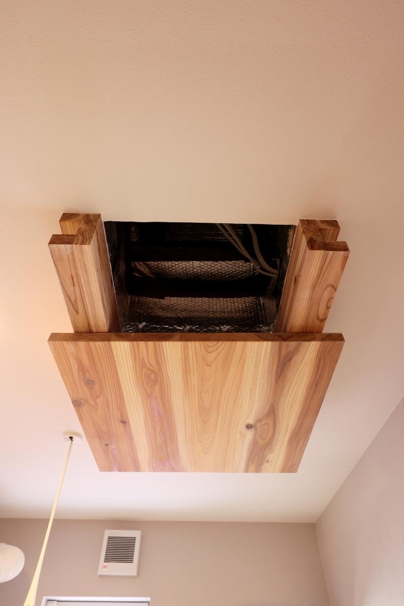 寒い季節は1階のストーブで暖まった空気が吹き抜けから2階に上ります。DCモーター付き換気扇によって空気を集めて温度を均一化。風道を通って1階の脱衣所へと送られます。