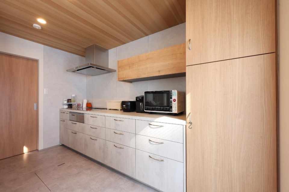 コンロは壁側に配置。写真左手は洗面脱衣室につづく引き戸で、右手前にはパントリーにもなる大型の造作収納を備えました。