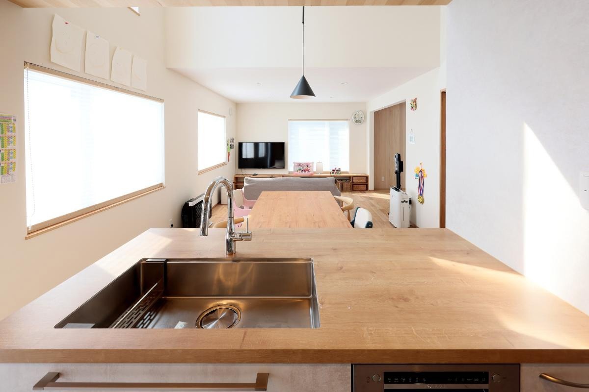 奥さまは、作業がしやすい広い天板が気に入っているそう。リビングダイニングで過ごす子どもたちの様子を、見渡すことができます。