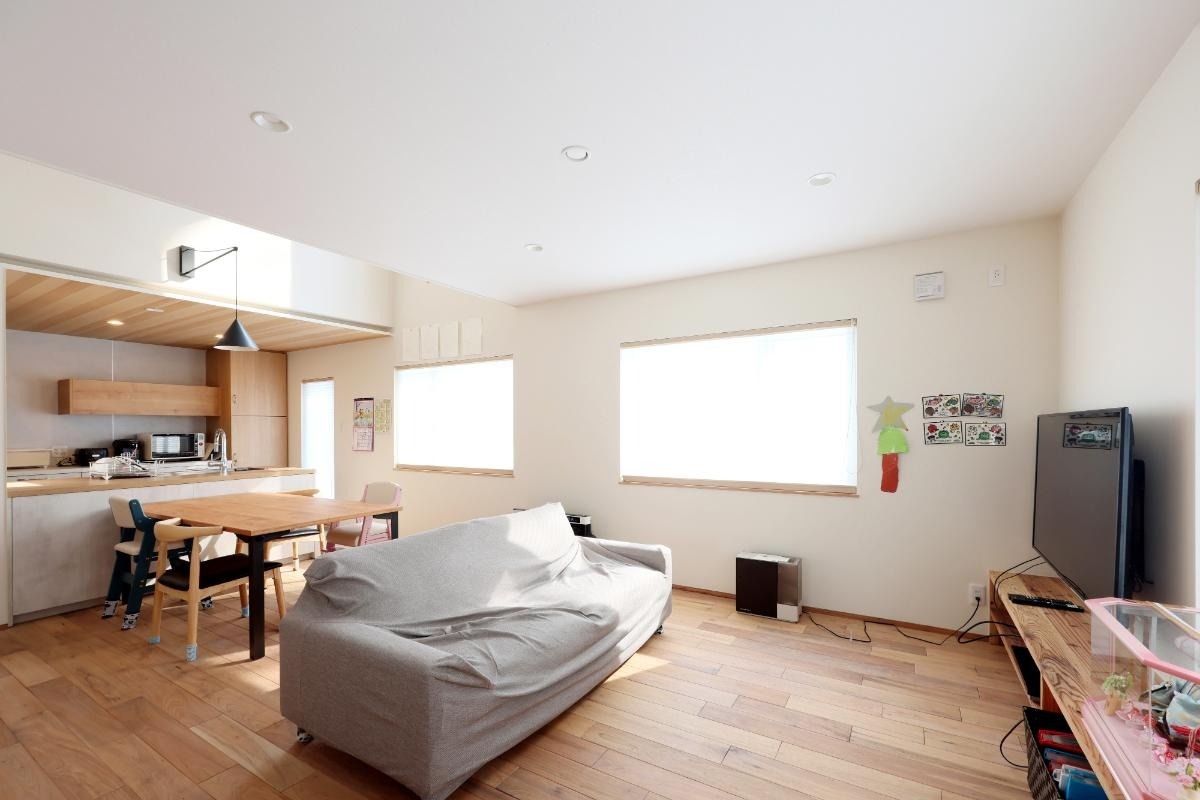 LDKはひと続きの大きな空間になりました。床材に採用したクルミの無垢材は、足裏に優しく、子どもも大人も裸足で過ごしているそうです。