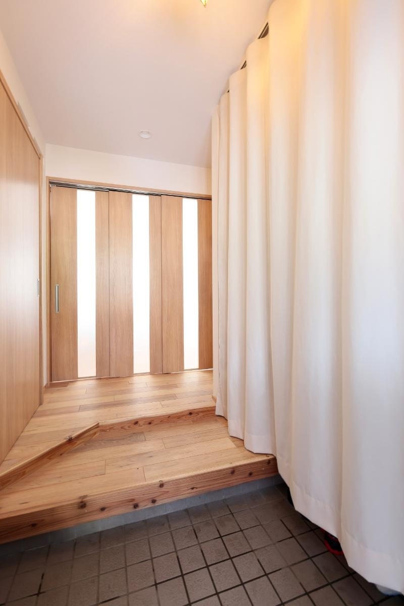 玄関正面の引き戸はリビングドアです。左手は洗面ユーティリティー、右手にはシューズクローゼットがありカーテンで目隠ししています。