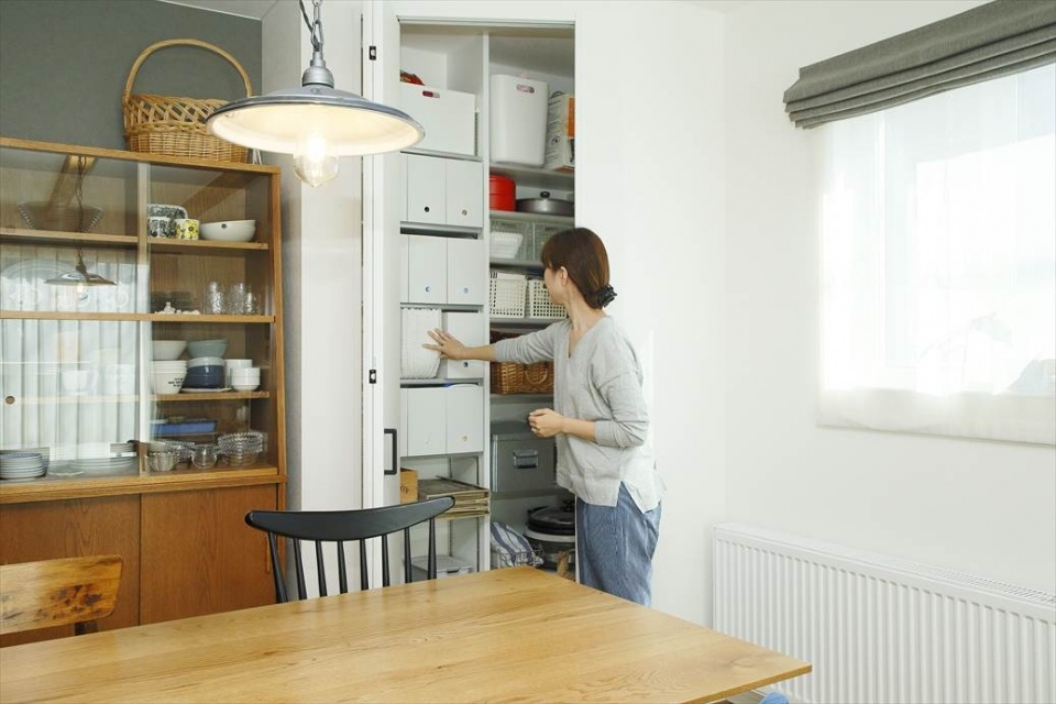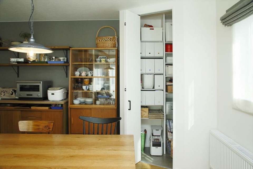 キッチンの隅には、斜めに仕切ったパントリーがしつらえてあります。