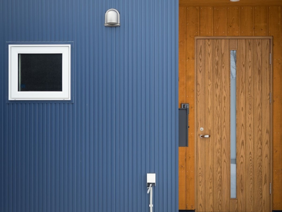 S邸は、ガルバリウム主体のシャープな印象の強い外観ですが、ワンポイントとして外観は一部(玄関まわり)を木(ホワイトアッシュ)にしました。オークの色味に塗装してブルーとの色味をコーディネート。自然素材いっぱいの室内を予感させる、やさしい雰囲気のエントランスです。