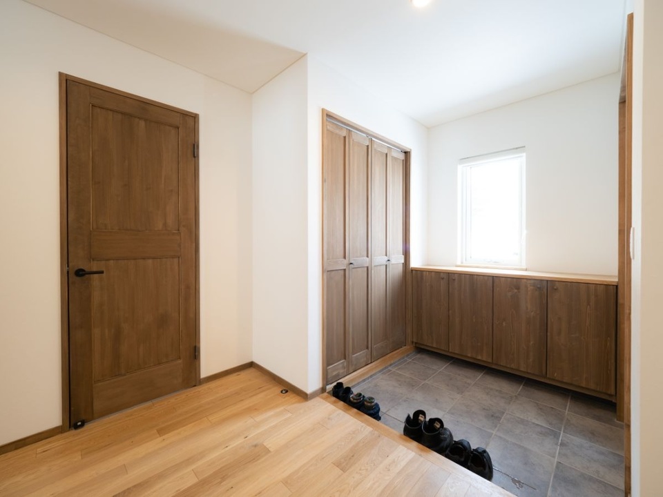 玄関まわりは、白を基調に木の建具がナチュラルな雰囲気です。クローゼットなど収納はふんだんに用意しているため、生活感は控えめに、整理収納がしやすくなります。