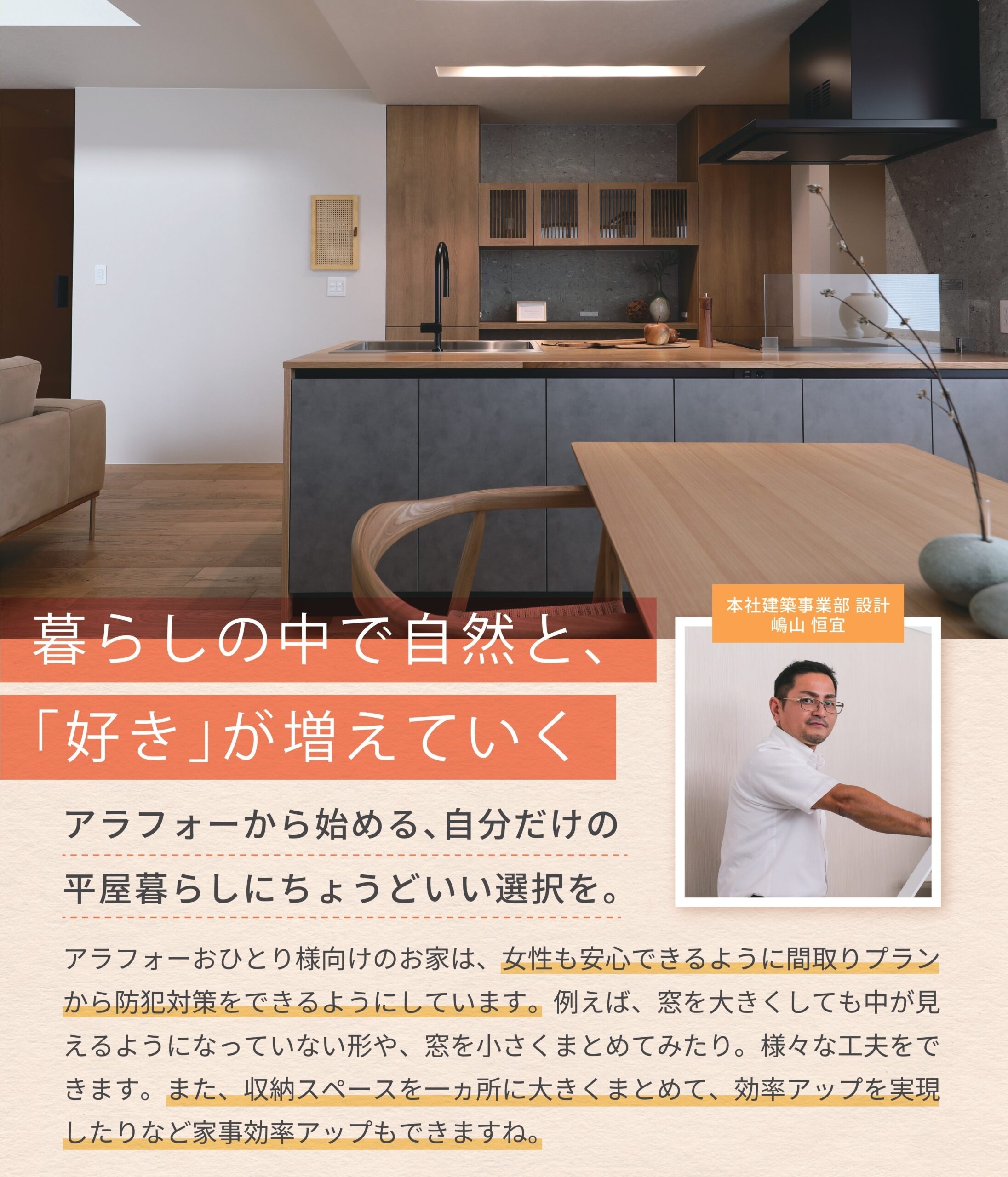 暮らしの中で自然と「好き」が増えていく「広すぎず狭すぎない」「手間が少なく心地よい」そんな暮らしを実現する平屋を。これからの生活を「ちょうどいいバランス」で整えたい、そんなアラフォー女性にもぴったりです。
