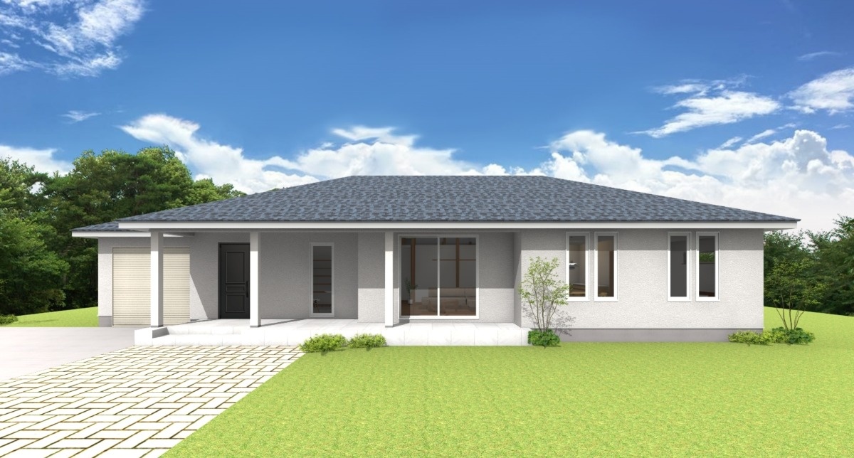 寄棟の屋根にアスファルトシングル材を組み合わせた存在感のある外観です。