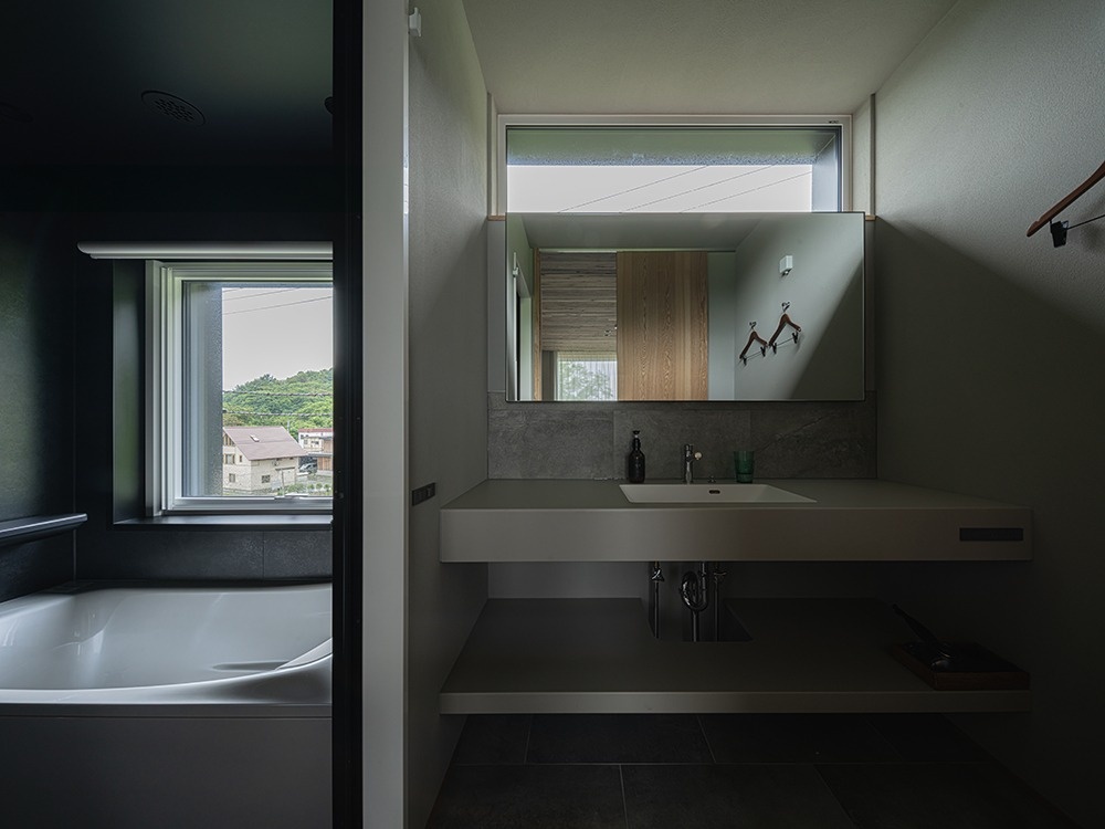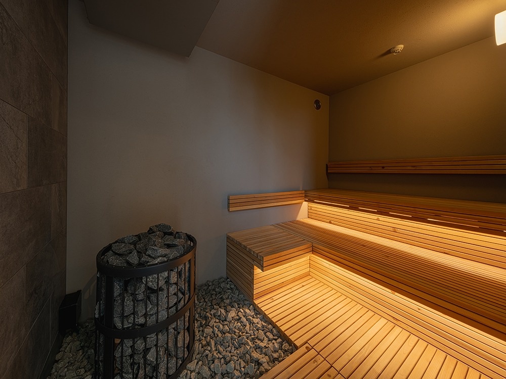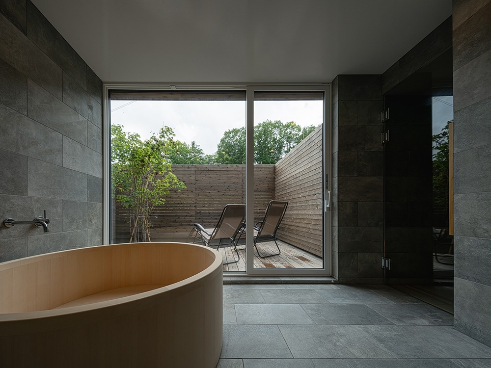 1階にはプライベートサウナ、2階には石狩湾を一望できるLDKを配置した、