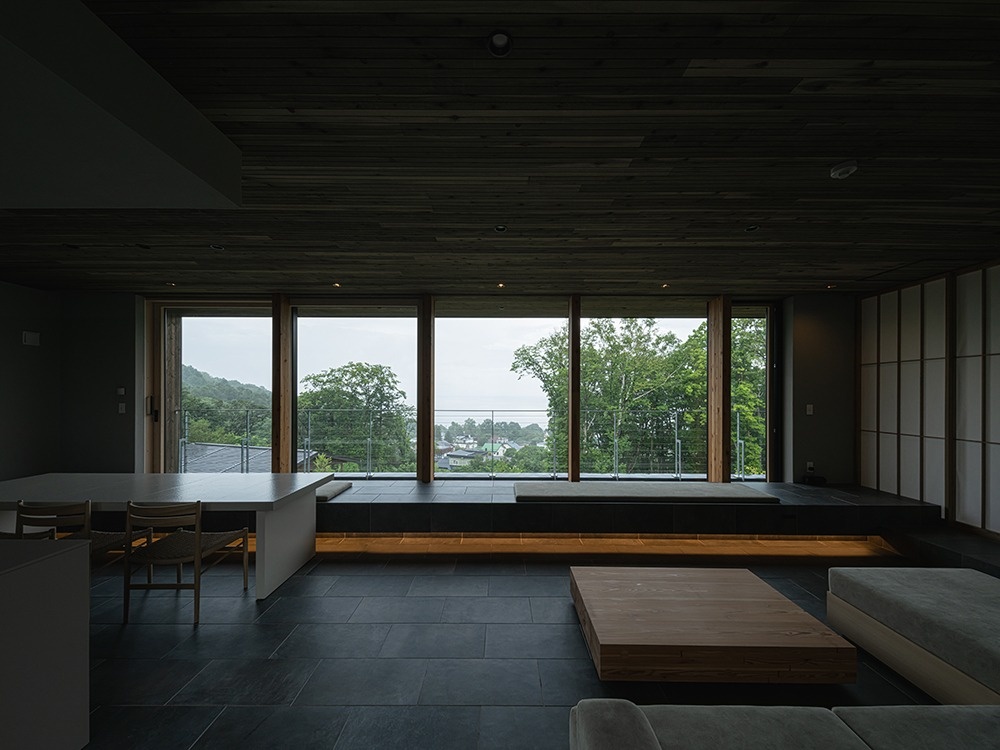 階段を上がると、正面には海を望む大開口の窓が広がります。