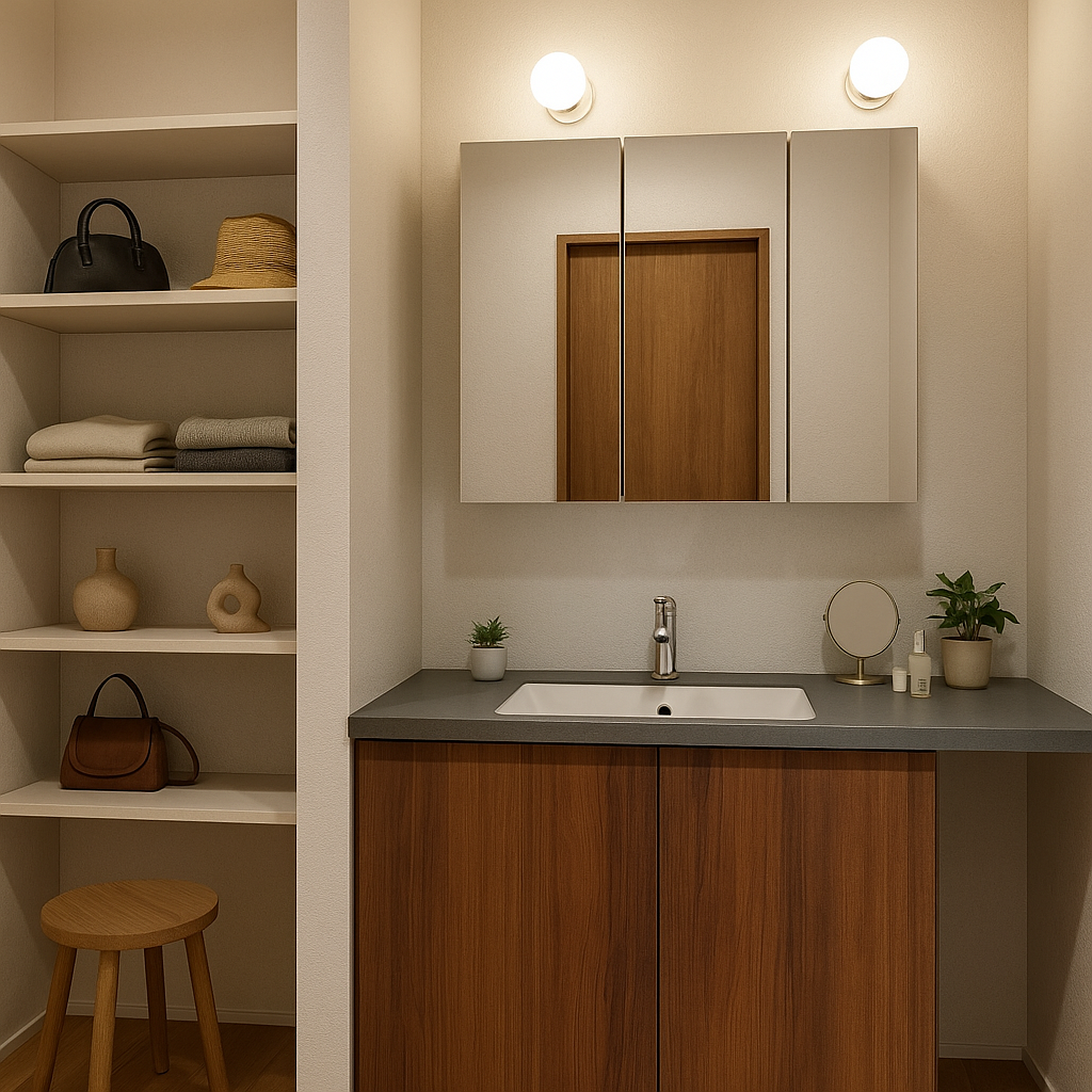 玄関ホールには、見た目も機能も心地よさも両立した、幅120cmの幅広洗面。