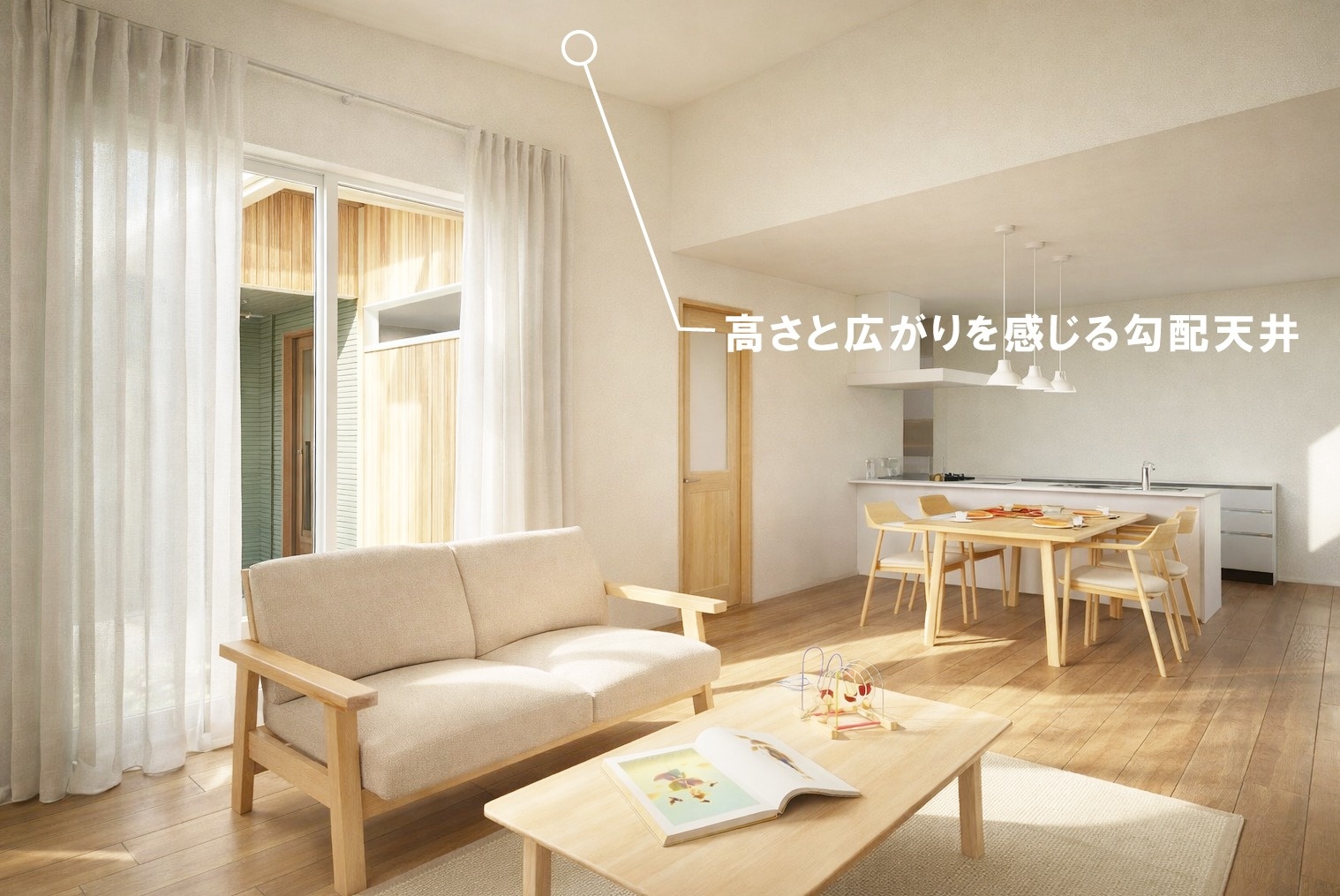 光と空間の広がりが美しく、平屋とは思えない開放感を感じることができます。