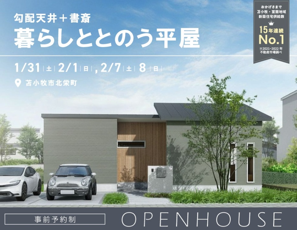 【お客様邸見学会】勾配天井と書斎のある、暮らしととのう平屋のお家|1/31(土)-2/1(日),2/7(土)-8(日)苫小牧市北栄町で完成見学会