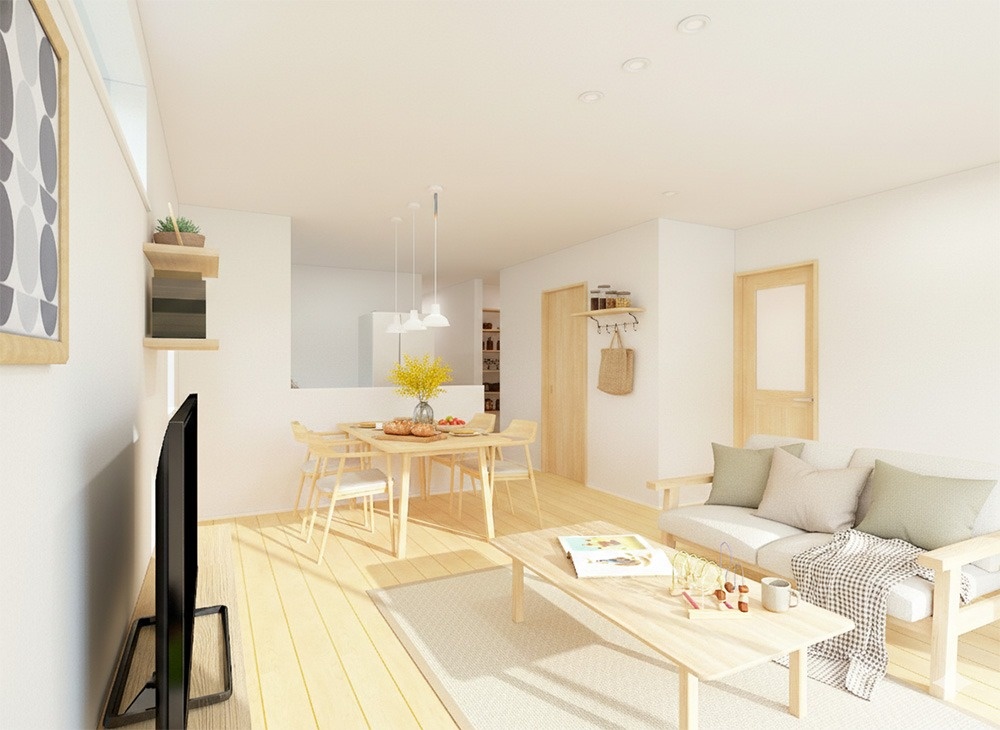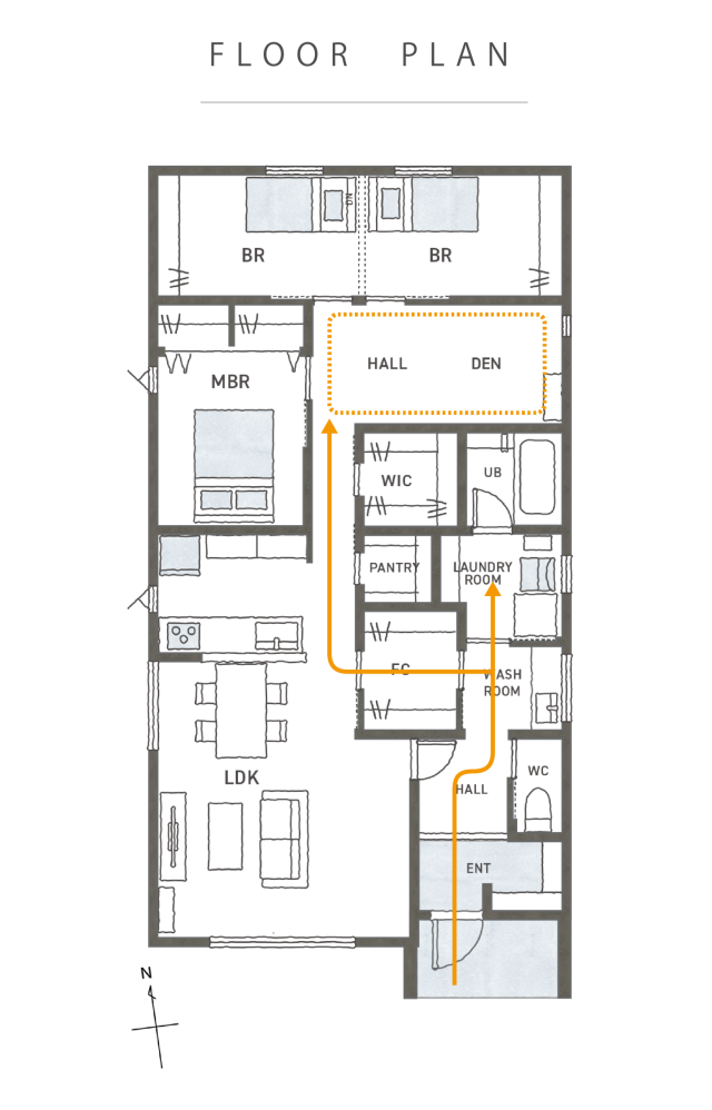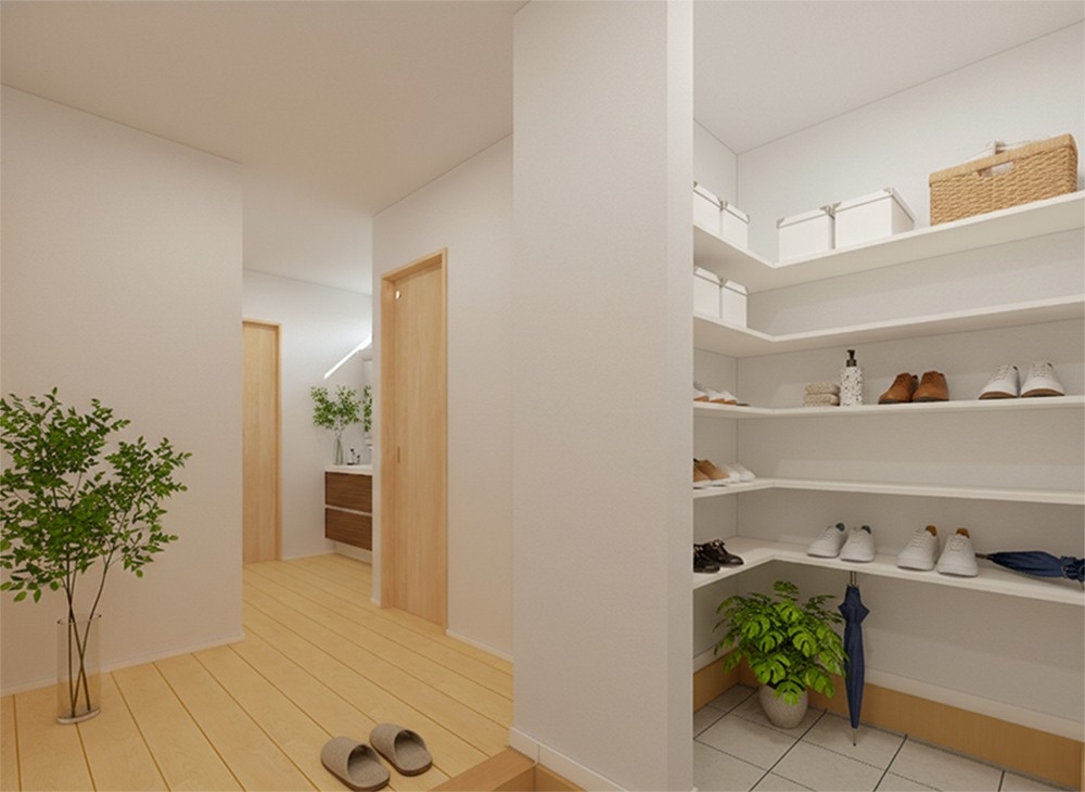 玄関→手洗い→ファミクロ→リビングの黄金ルート。外の汚れをリセットしてリラックスタイムへ直行できる、計算し尽くされたレイアウト。